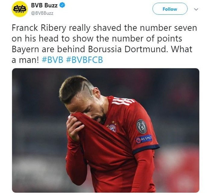 Gaya rambut Frank Ribery yang bertuliskan angka "7" pun jadi candaan lantaran selisih poin antara keduanya juga tujuh. Foto: Istimewa