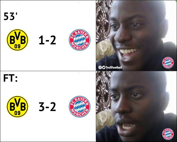 Tak pelak fans Bayern yang awalnya girang karena unggul terlebih dahulu jadi melongo di akhir. Foto:Β Twitter/TrollFootball