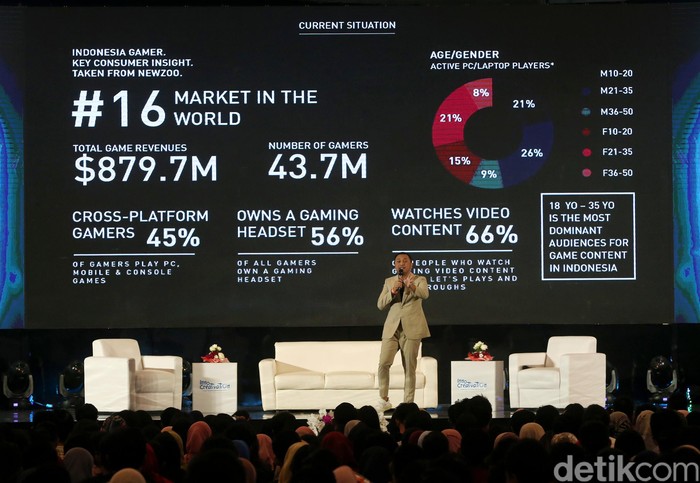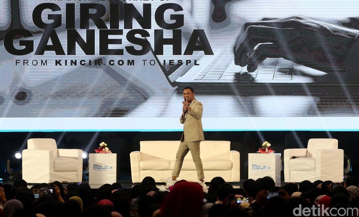 Sambil berkeliling panggung Giring memaparkan potensi e-sport di Indonesia.