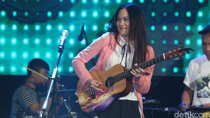 Sambil bermain gitar, Sheryl terlihat sangat semringah.