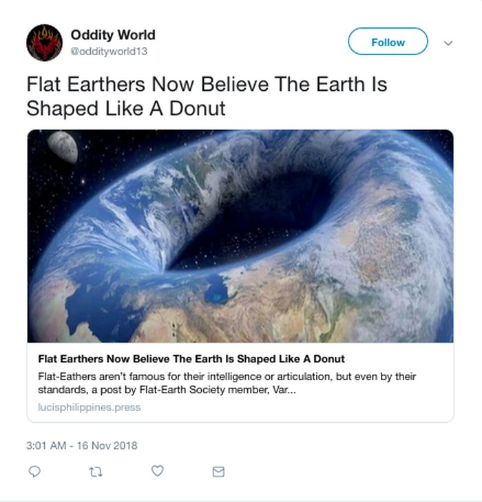 Pekan ini para penganut teori Bumi Datar menggelar konferensi internasionalnya yang kedua di AS. Seiring dengan itu, ramai pula dibahas teori Bumi Donat. (Foto: Internet/Twitter)