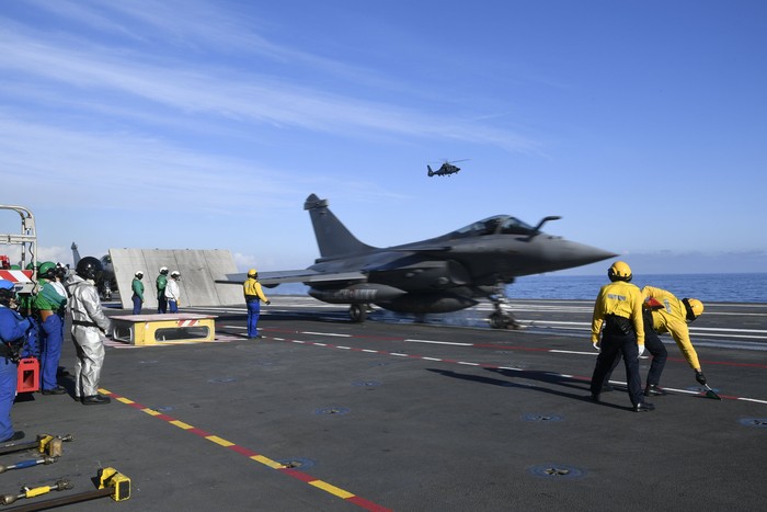 Pesawat Rafale yang diangkut Charles de Gaulle unjuk gigi di atasnya. Foto: Reuters