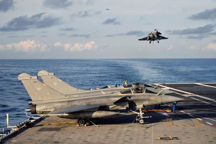 Pesawat Rafale yang juga buatan Prancis beraksi de deknya. Kapal Charles de Gaulle direnovasi dengan biaya 1,3 miliar euro atau di kisaran Rp 21 triliun. Foto: Reuters