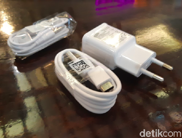 Charger-nya menggunakan USB 3.0 untuk fast charging. Semua aksesorisnya menggunakan warna putih yang sudah menjadi ciri khas Samsung. Foto: Virgina Maulita Putri/detikinet