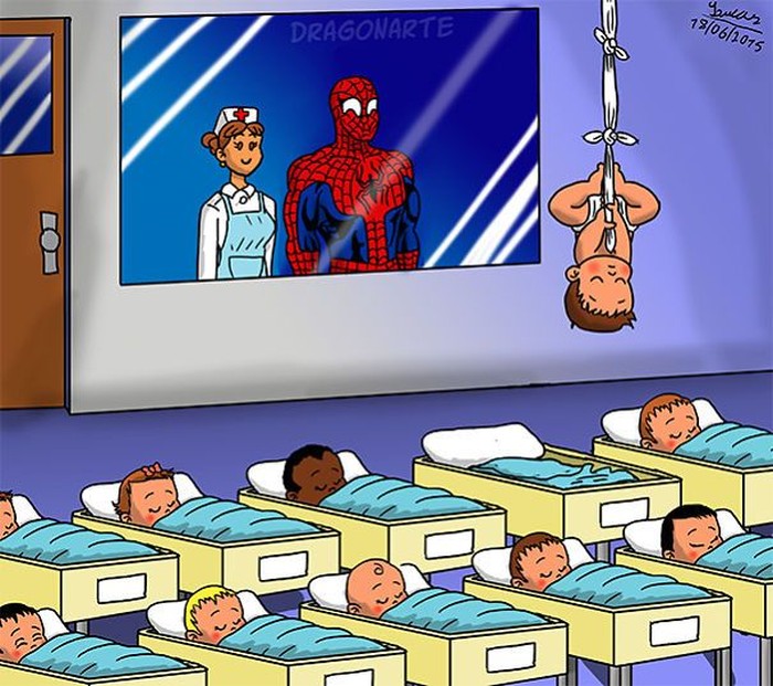 Anak Spider-Man, baru lahir sudah bergelantunganΒ seperti bapaknya. (Foto: instagram/dragon_arte)
