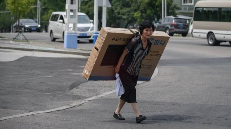 Tengok aksi perempuan paruh baya ini memanggul boks televisi layar datar, bukan lagi televisi layar cembung alias CRT. Oke, memang belum tentu ada televisi di dalam boks tersebut. (Foto: Ed JONES/AFP)
