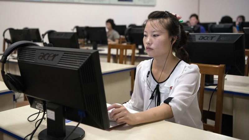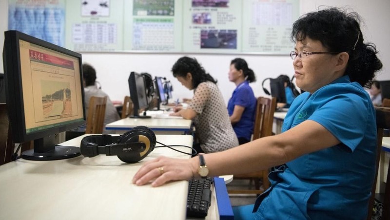 Para pekerja di sebuah pabrik diajari agar tetap melek teknologi dengan penggunaan komputer di ruang latihan IT di Pyongyang. (Foto: Carl Court/Getty Images)