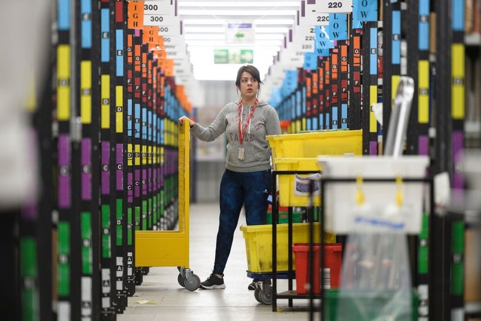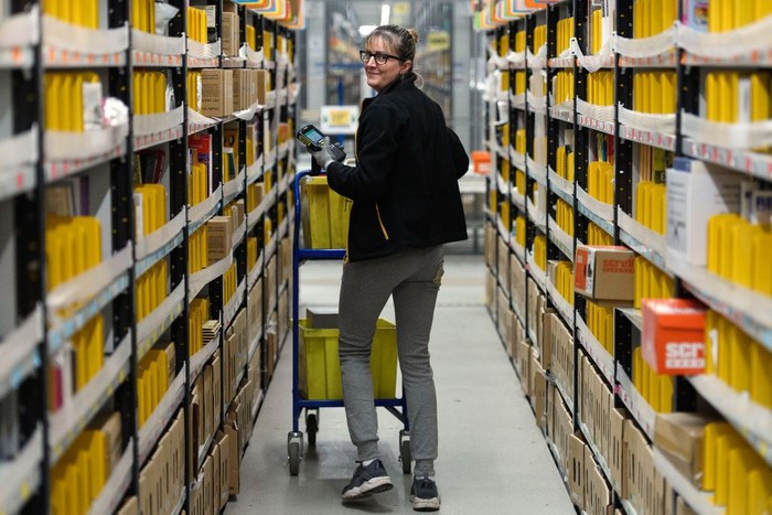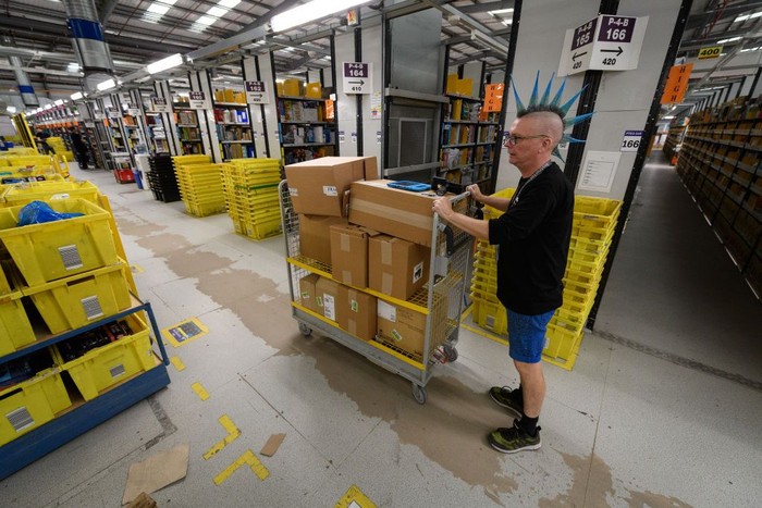 Para karyawan menuju ke rak-rak untuk mengambil pesanan yang dibeli konsumen Amazon. Foto: Getty Images