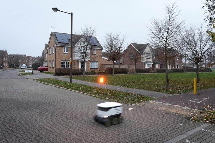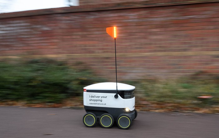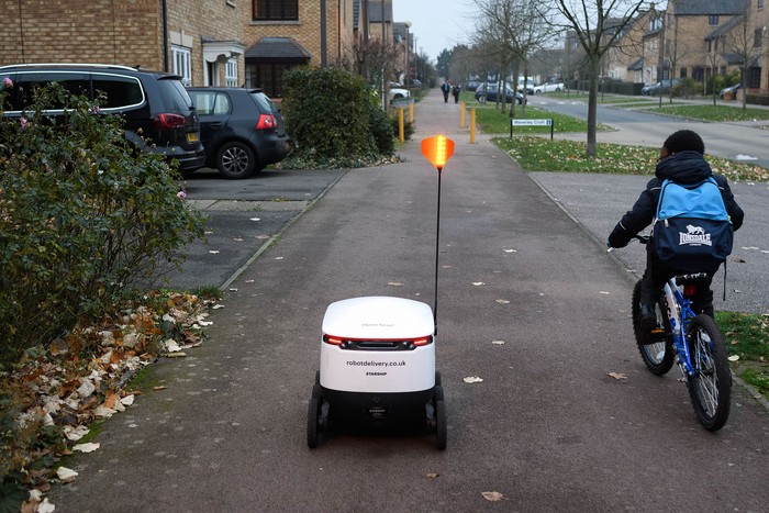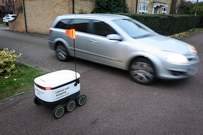 Salah satu robot kurir milik supermarket Co-op tengah beroperasi di sekitar kawasan Milestone Keynes, Inggris. Robot itu diketahui memiliki enam roda dan dapat melakukan perjalanan dengan kecepatan hingga 4mph (6.4kmh) per jam. Selain itu, robot kurir itu pun memiliki kompartemen aman di mana paket dengan berat maksimum 10kg (22 pon) dapat diangkut dan hanya dapat diakses oleh konsumen melalui tautan yang dihasilkan oleh aplikasi smartphone.