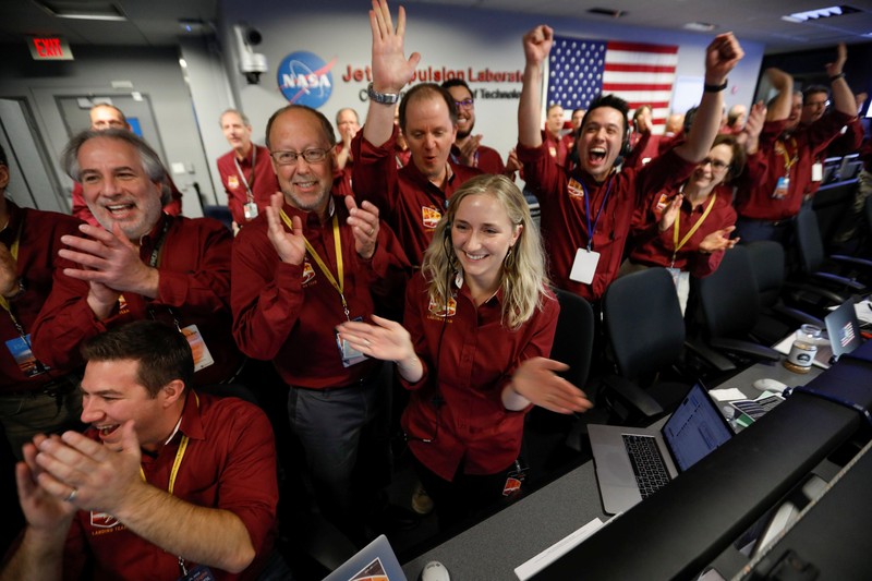 Suasana gembira tampak dari video ruangan mission control di Jet Propulsion Laboratory di California. Foto: Reuters