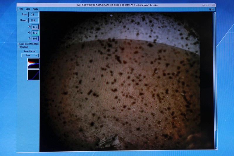 Ini adalah foto pertama yang dikirimkan oleh InSight begitu dipastikan mendarat dengan selama di pemukaan Mars. Foto: Reuters