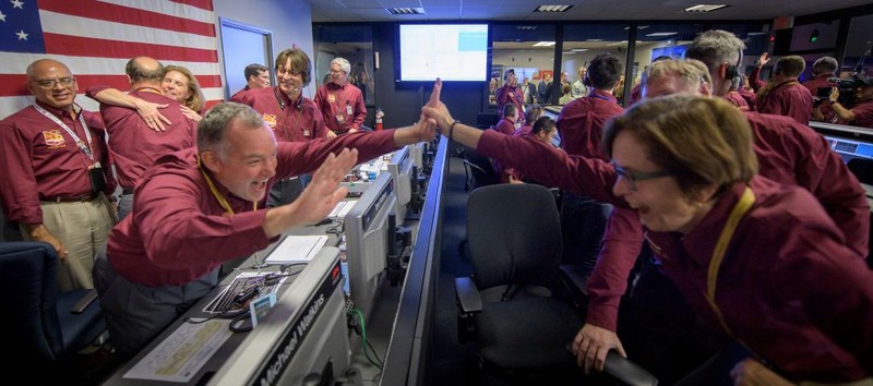Wahana antariksa InSight berhasil memenuhi misi pendaratan sukses di Mars, tepat tanggal 26 November waktu setempat. Tampak Project Manager InSight Tom Hoffman menjadi salah satu yang gembira bukan kepalang. (Foto: Bill Ingalls/NASA via Getty Images)