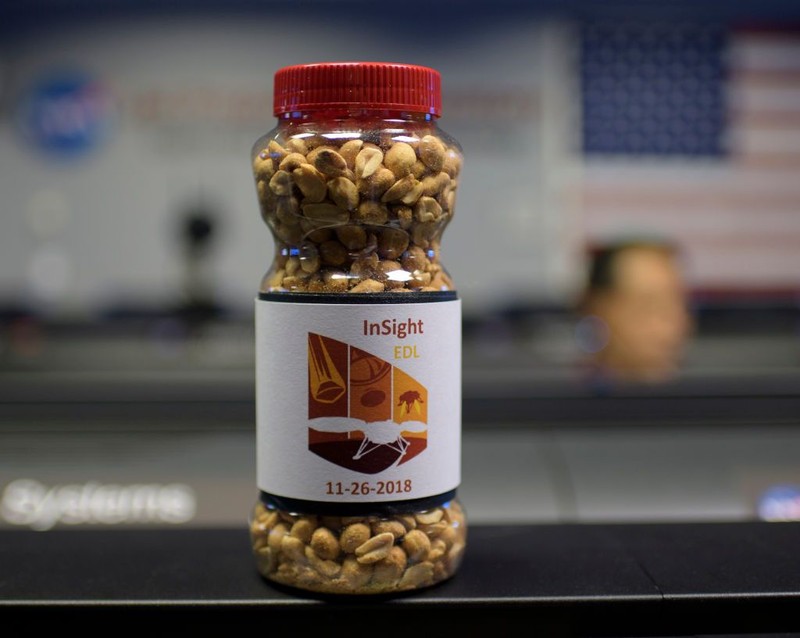 Toples kacang berlabel tanggal 26 November 2018, waktu estimas pendaratan InSight, di Mission Control Area (MSA) Laboratorium NASA, California, tempat berkumpulnya tim pendaratan Mars InSight. (Foto: Bill Ingalls/NASA via Getty Images)