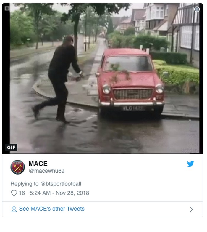 Atau aksi Mourinho banting botol lebih mirip adegan memukuli mobil dengan ranting pohon ini? (Foto: Internet/Twitter)