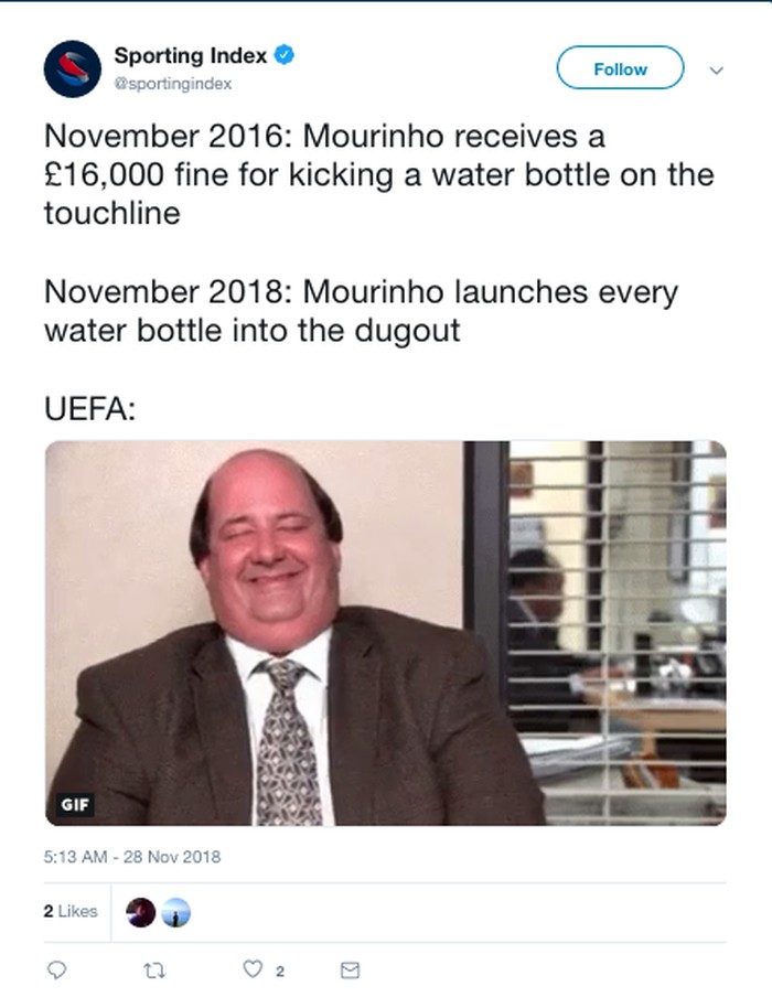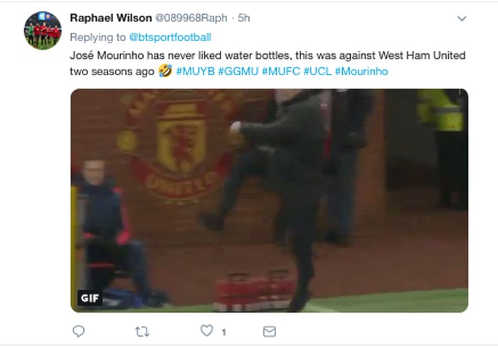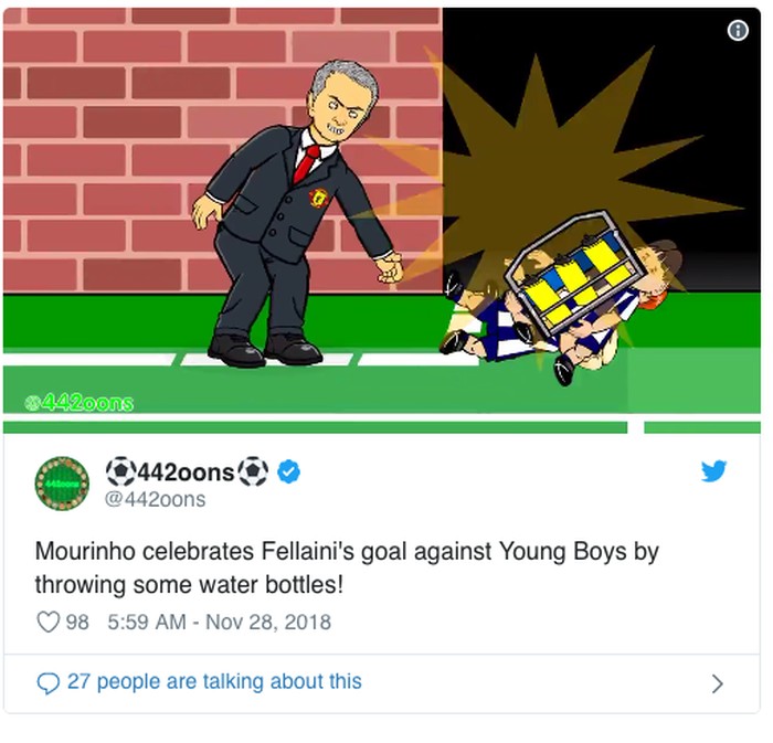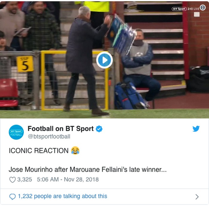 Mourinho dulu kena denda cukup besarΒ saatΒ menendang sebuah botol. Karena kini yang terlibat adalah sekumpulan botol, bisa-bisa Mourinho kena denda lebih besar -- dalam hitunganΒ per botol. (Foto: Internet/Twitter)
