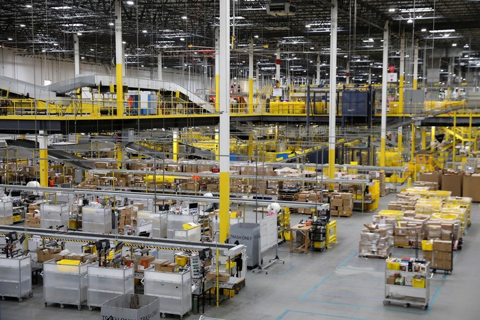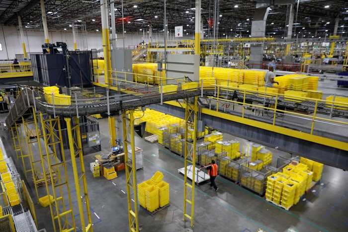 Ini adalah suasana salah satu gudang Amazon yang berlokasi di Robbinsville, New Jersey, Amerika Serikat pada 26 November 2018. Foto: Reuters