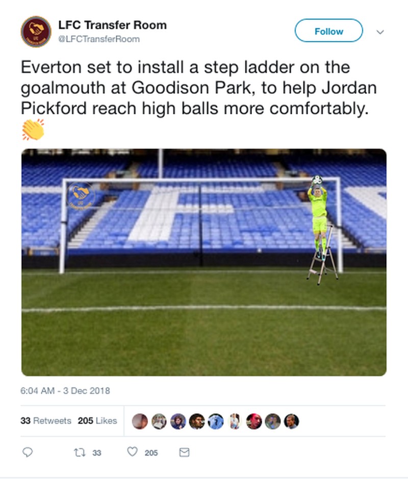 Pickford, kiper Everton, kena olok-olok atas gol Liverpool. Ia disalahkan akibat bikin blunder dan dicibir bertangan pendek. (Foto: Internet/Twitter)