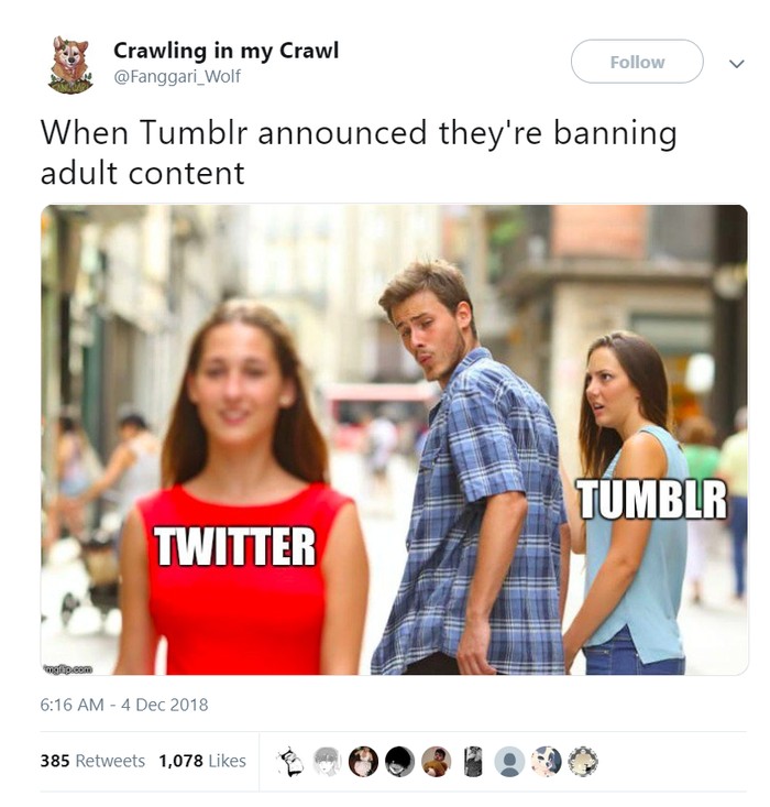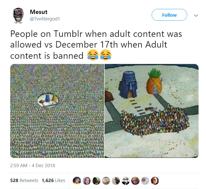 Seperti meme ini yang menggambarkan eksodus pengguna Tumblr ketika kebijakan tersebut diterapkan. Foto: Twitter