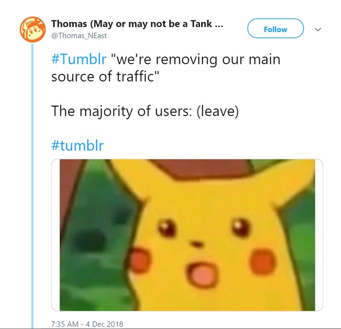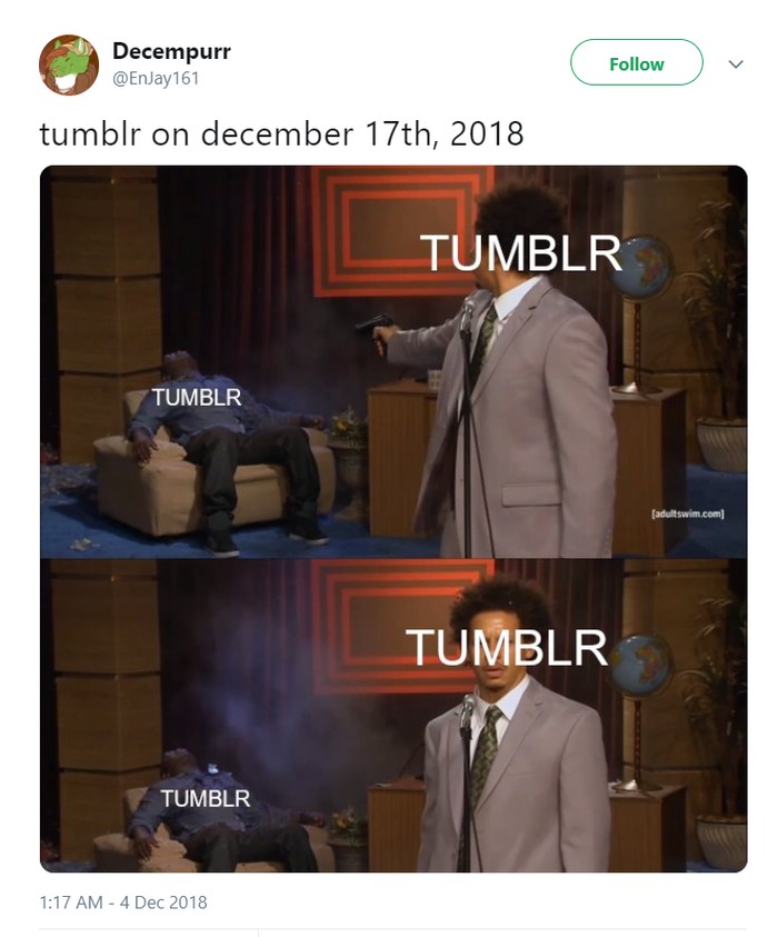 Tumblr diibaratkan membunuh dirinya sendiri dengan menerapkan kebijakan ini. Foto: Twitter