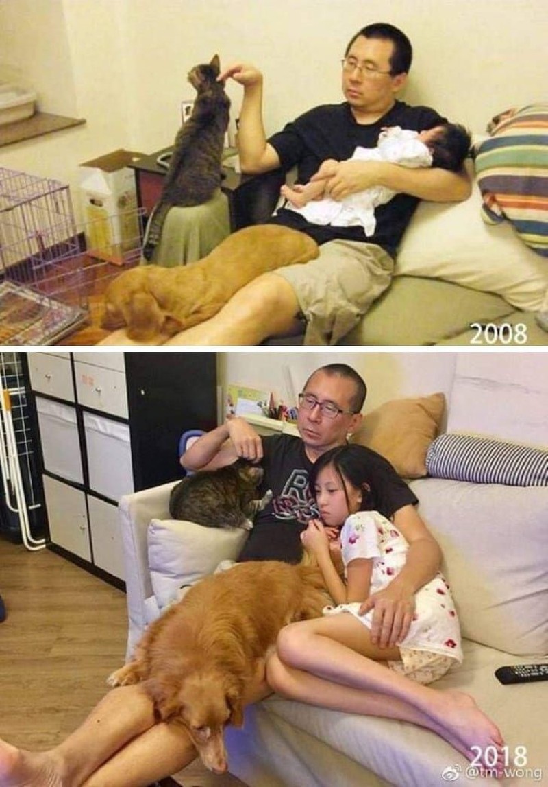 Dulu dan sekarang anjing ini tumbuh bersama dengan tuannya. (Foto: Brightside)