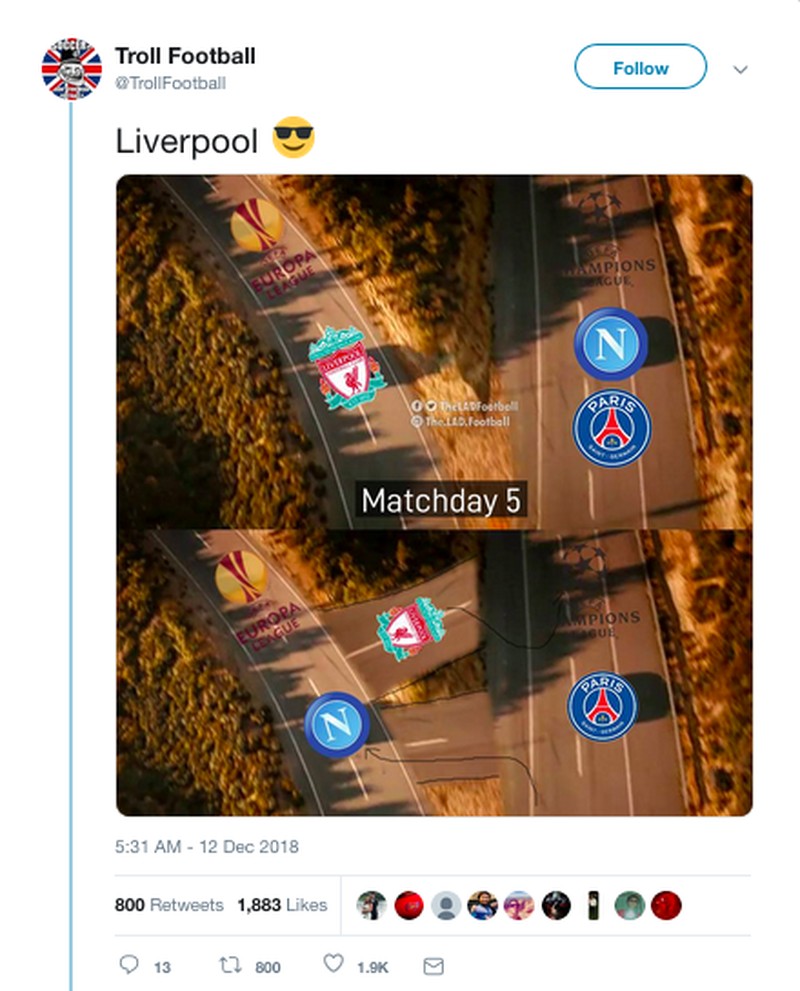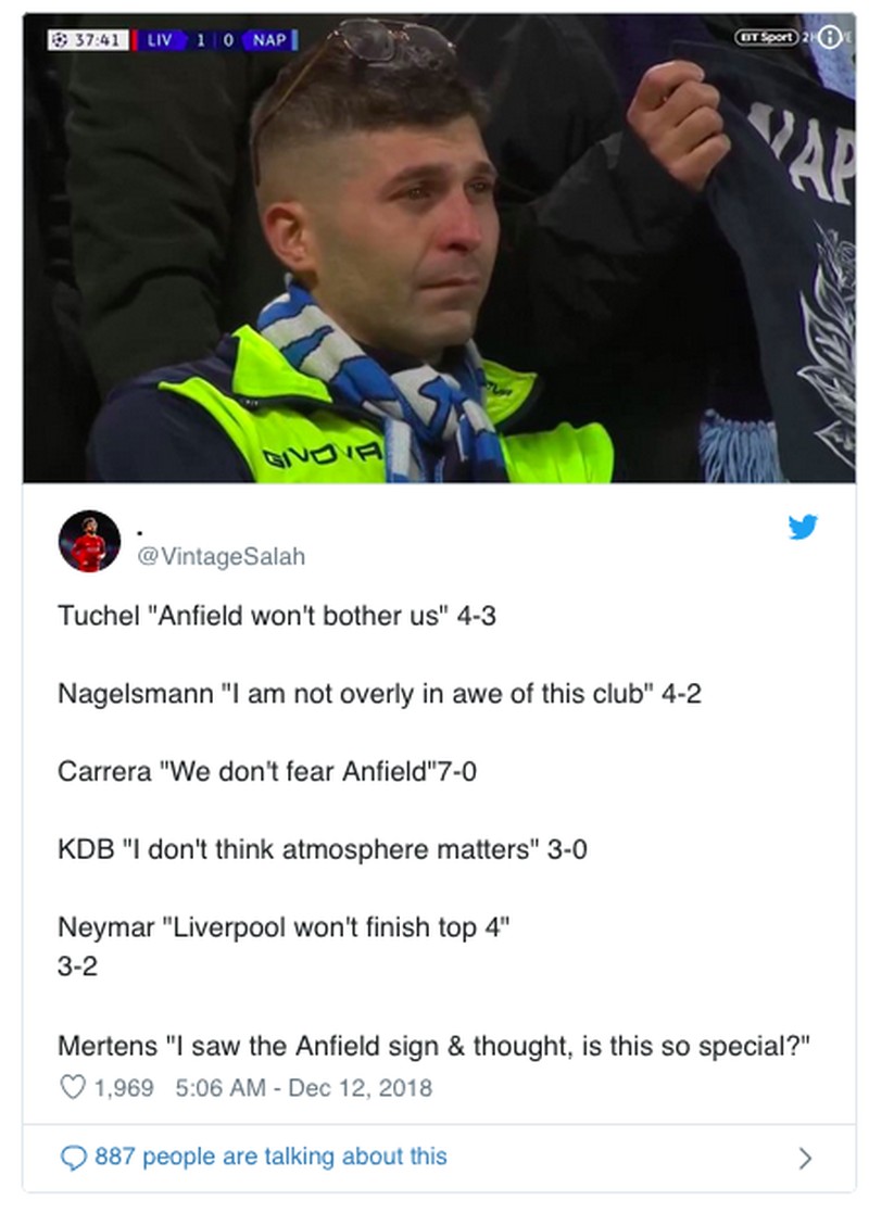 Liverpool beberapa kali diremehkan lawan-lawannya, tapi meme ekspresi fans Napoli ini sekali lagi menegaskan The Reds sudah mampu unjuk gigi. (Foto: Internet/Twitter)