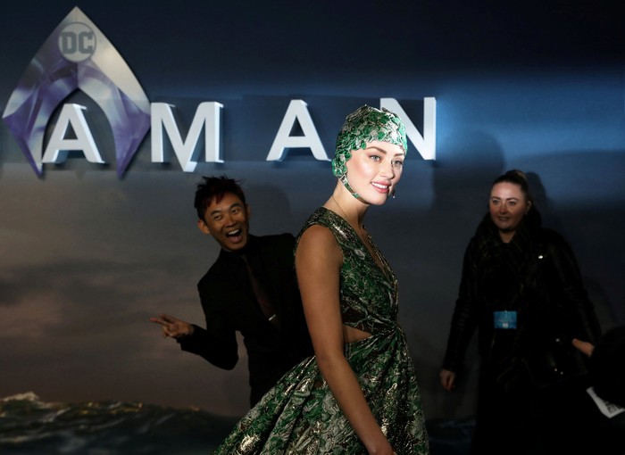 Amber bersama Jason Momoa yang berperan sebagai tokoh utama, yaitu Arthur Curry sang Aquaman. Ia naksir pada Mera. Foto: Reuters