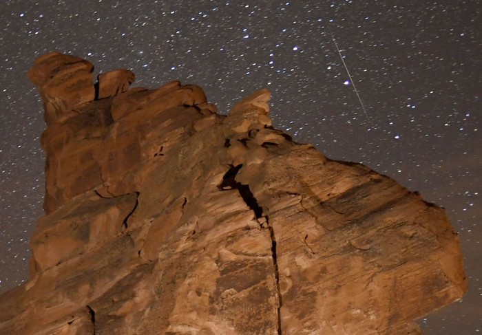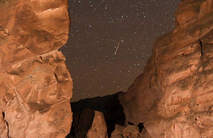 Begini penampakan hujan meteor Geminid di lokasi wisata Seven Sisters di Nevada, AS. Foto: Ethan Miller/Getty Images