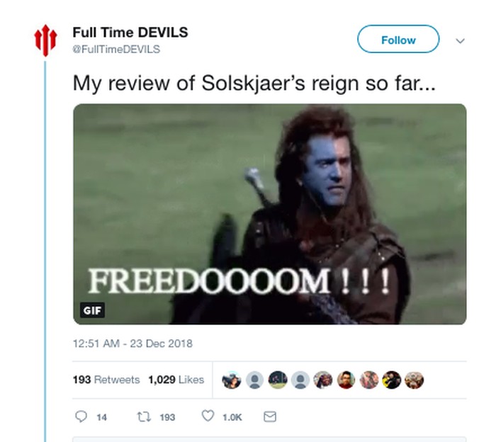 Adegan dari film Braveheart ikut dicomot, menilai para pemain MU kini bisa main lebih bebas dan lepas bersama Solskjaer.Β (Foto: Internet/Twitter)