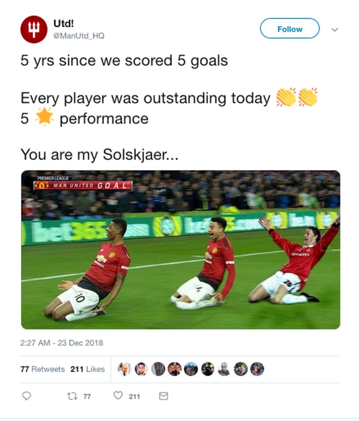 Gambar olahan yang memunculkan Solskjaer, semasa bermain, ikut merayakan gol. (Foto: Internet/Twitter)