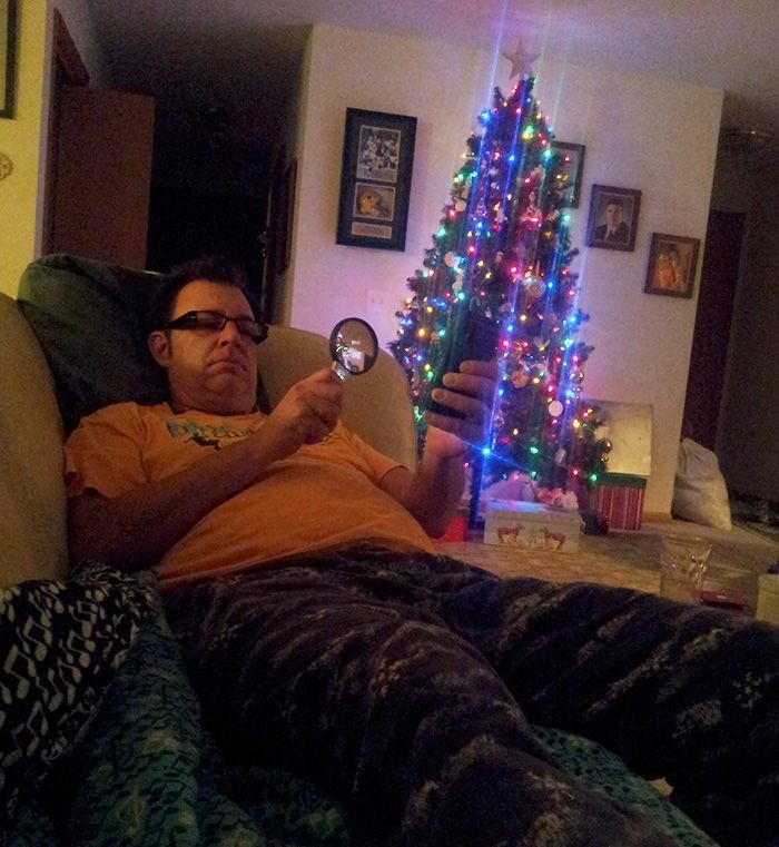 Membuka aplikasi Facebook di ponsel dengan bantuan kaca pembesar. Foto: gslayton via Bored Panda