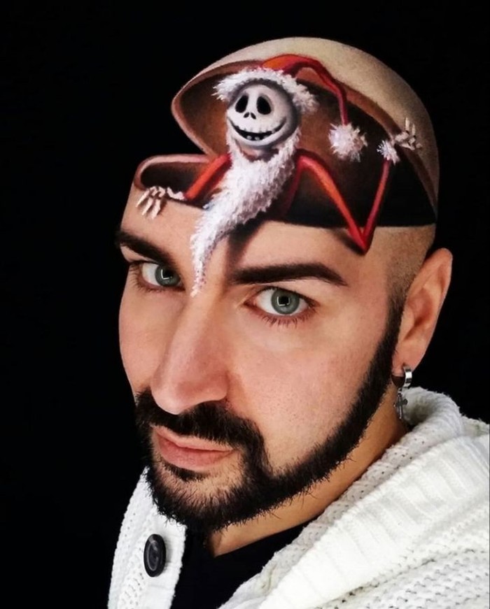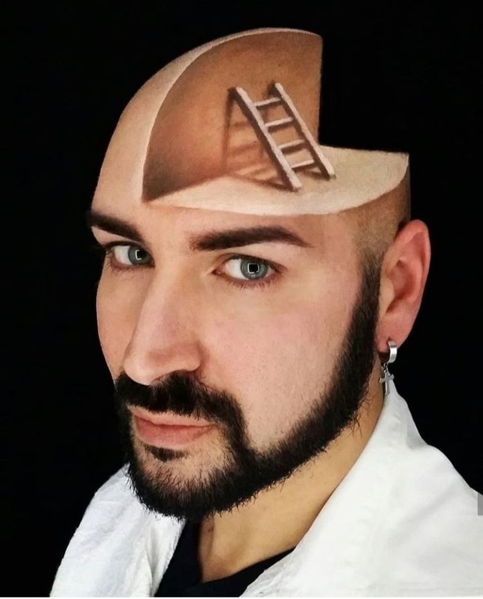 Dengan sudut pandang mata uang pas, maka kita bisa melihat lukisan aliran surealis di kepala Luca tampak nyata. Foto: Instagram @lucaluceaetgallery_makeup