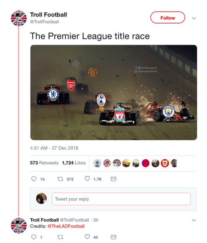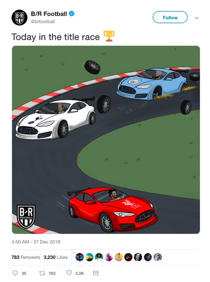 Satu lagi gambaran analogi persaingan Premier League Inggris; Liverpool memimpin, City malah rontok. (Foto: Internet/Twitter)
