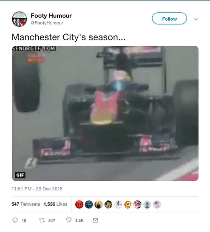Netizen ini mengibaratkan musim City kini seperti mobil F1 itu; kedua ban depannya copot di lintasan. (Foto: Internet/Twitter)