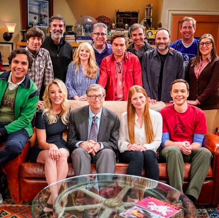 Bill Gates duduk paling depan bersama putri sulungnya, Jennifer. Mereka berfoto bersama para pemeran serial Big Bang Theory. Foto: Instagram