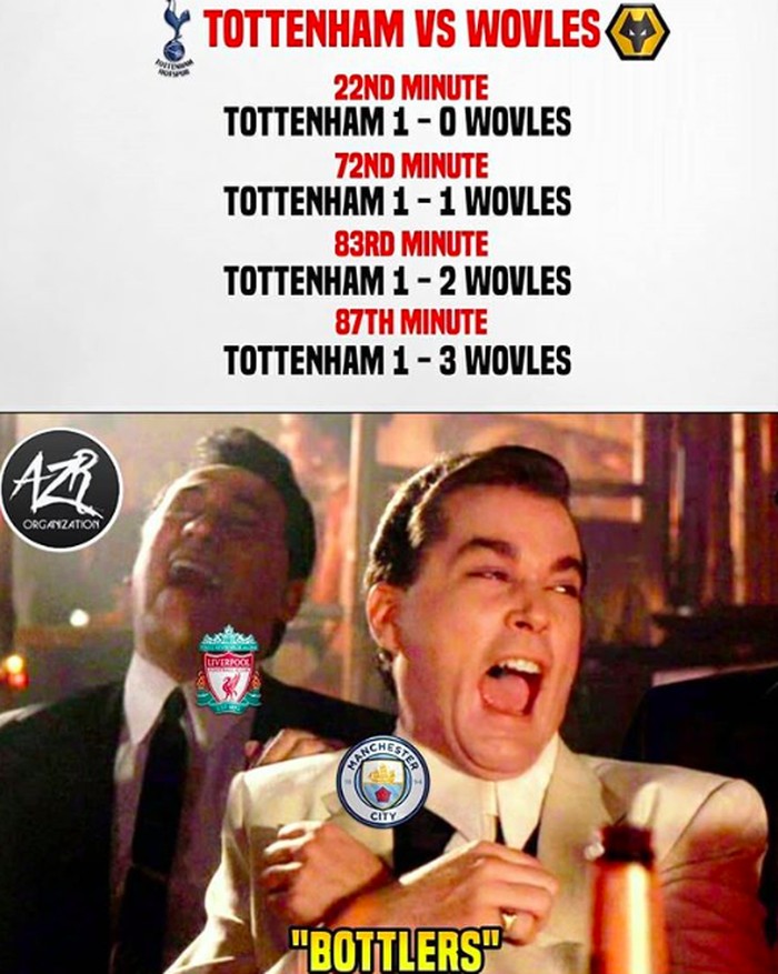 Liverpool dan Manchester City digambarkan tertawa melihat bagaimana Tottenham yang sempat unggul akhirnya takluk. Foto: Twitter