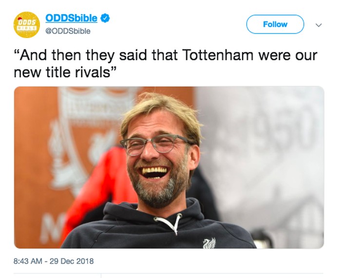 Klopp tertawa lagi mendengar Tottenham adalah rival terberat Liverpool di musim ini. Foto: Twitter