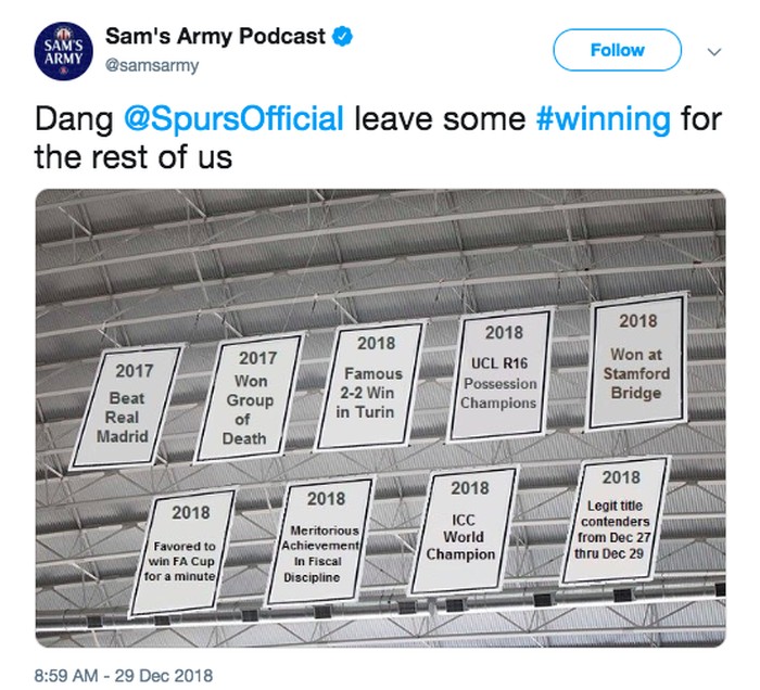Sudah sangat lama tak mencicipi gelar jawara apapun, prestasi Spurs mungkin sebatas ini. Foto: Twitter