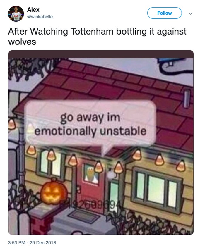 "Pergilah, aku tidak stabil secara emosional," sebut fans Spurs setelah menyaksikan timnya kalah 1-3 dari Wolves, di kandang sendiri lagi. Foto: Twitter