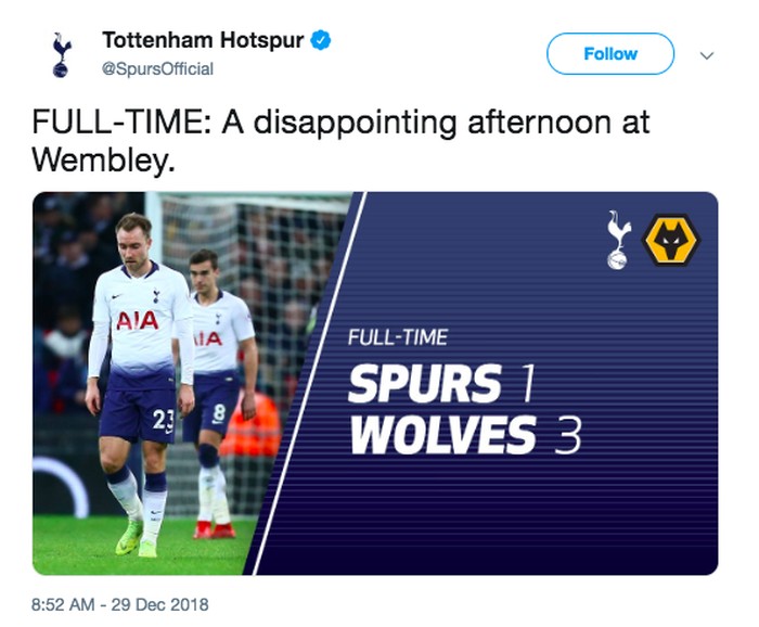 Akun Twitter Spurs pun menyebutkan kekalahan dari Wolves mengecewakan. Foto: Twitter