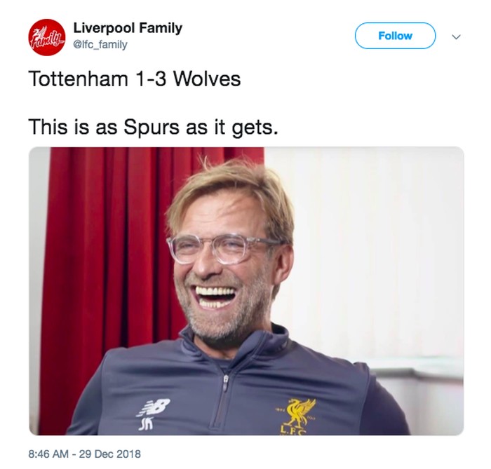Jurgen Klopp digambarkan tertawa melihat kekalahan Spurs. Foto: Twitter