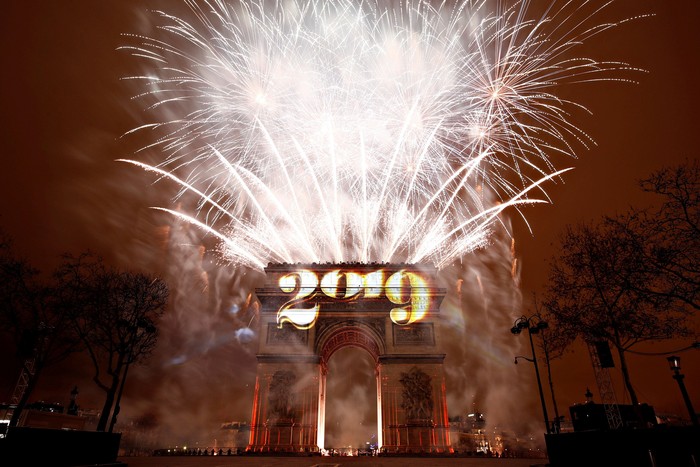 Kemeriahan pergantian tahun di Arc de Triomphe, Paris, Prancis. Foto: REUTERS/Christian Hartmann