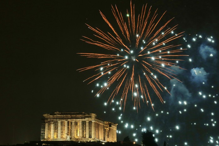 Kembang api di Acropolis, Athena, Yunani. Foto: Milos Bicanski/Getty Images Β