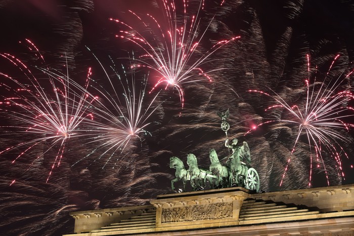 Kembang api di Brandenburg Gate, Berlin, Jerman. Foto: REUTERS/Axel Schmidt