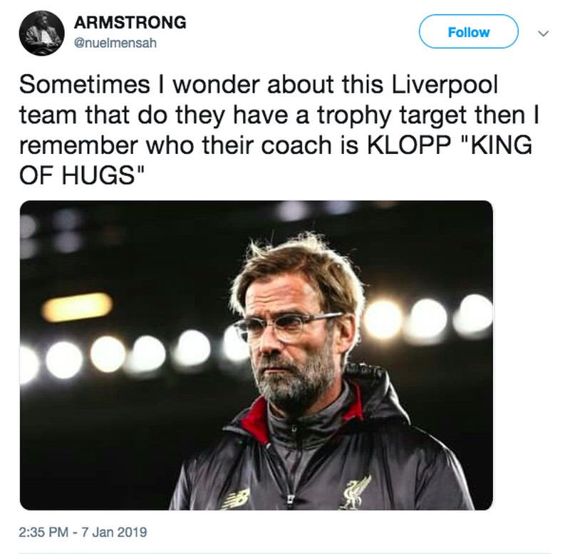 Jurgen Klopp kembali disindir sebagai 'raja memeluk' tapi tanpa prestasi. Foto: istimewa