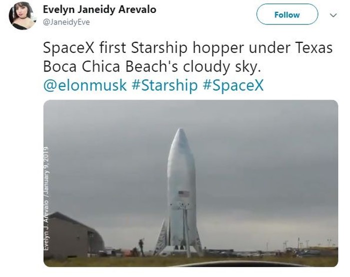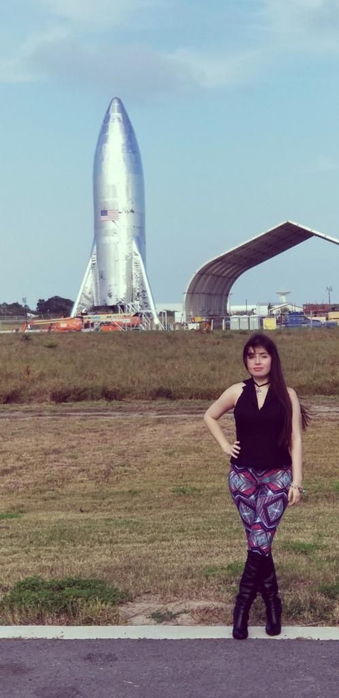 Selain itu, sosok perempuan bernama Evelyn Janeidy Arevalo juga membagikan potret dirinya yang sedang berada di depan roket Starship. Foto:Β Twitter/JaneidyEve
