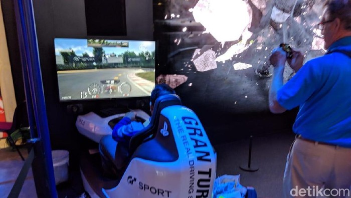 Bermain balap VR lengkap dengan kursi kemudi. (Foto: Adi Fida Rahman/detikINET)