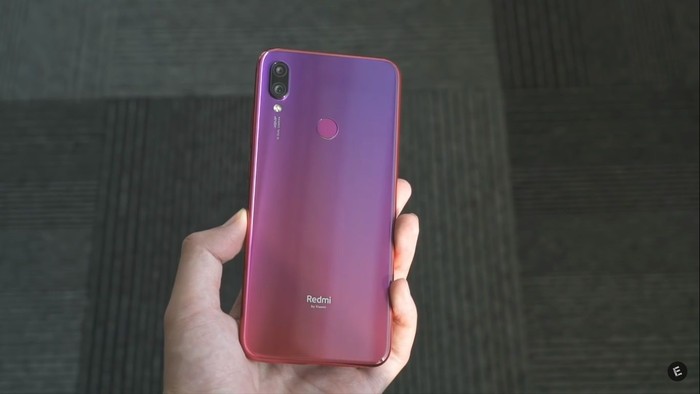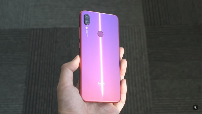 Tampilan belakang dari Redmi Note 7 yang memiliki gradasi warna. Foto: YouTube/Everything in one