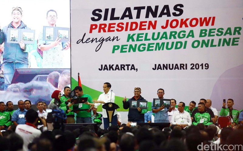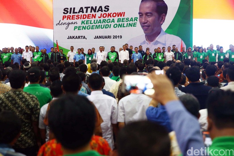 Presiden Joko Widodo (Jokowi) menghadiri acara silaturahmi nasional (Silatnas) pengemudi transportasi online di JIExpo Kemayoran Jakarta, Sabtu (12/1/2019).