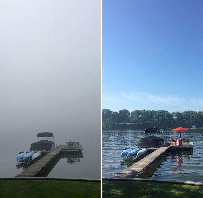 Perbedaan waktu pemandangan kota Michigan di waktu 9 pagi (kiri) dan jam 11 siang (kanann).Β Β (Foto: boredpanda)