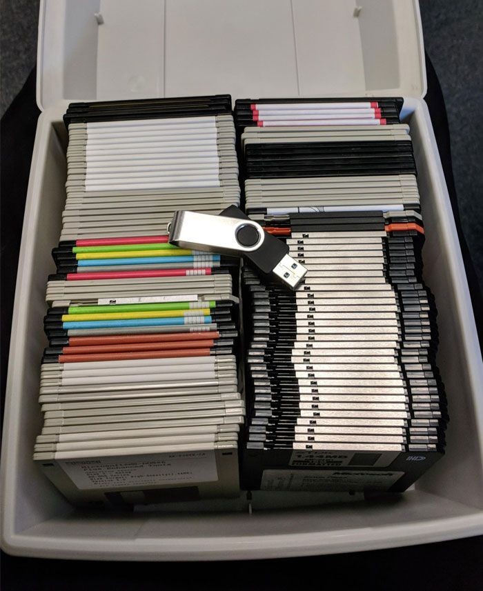 Puluhan disket yang jika dijumlahkan kapasitasnya berukuran 138,24 MB lalu dibandingkan dengan satu flashdisk dengan ukuran 128 GB. (Foto: Boredpanda)